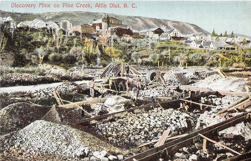 The Atlin gold rush was not quite as big as the Klondike gold rush back 1898 but it did garner world wide attention. What got it started was all these men hiking over the Chilkoot trail and beyond to get to Dawson City Yukon, some men ventured off in other directions. Two propsectors, Kenny MacLaren and Fritz Miller were two such people that didn't follow the crowd. Instead they headed east in an area just about 6 miles from where Atlin is today on Pine Creek and found gold. Lots of gold! Didn't take long and word got out that there was gold in Atlin and a lot of the men enroute to Dawson abandoned that idea and headed across to Atlin.